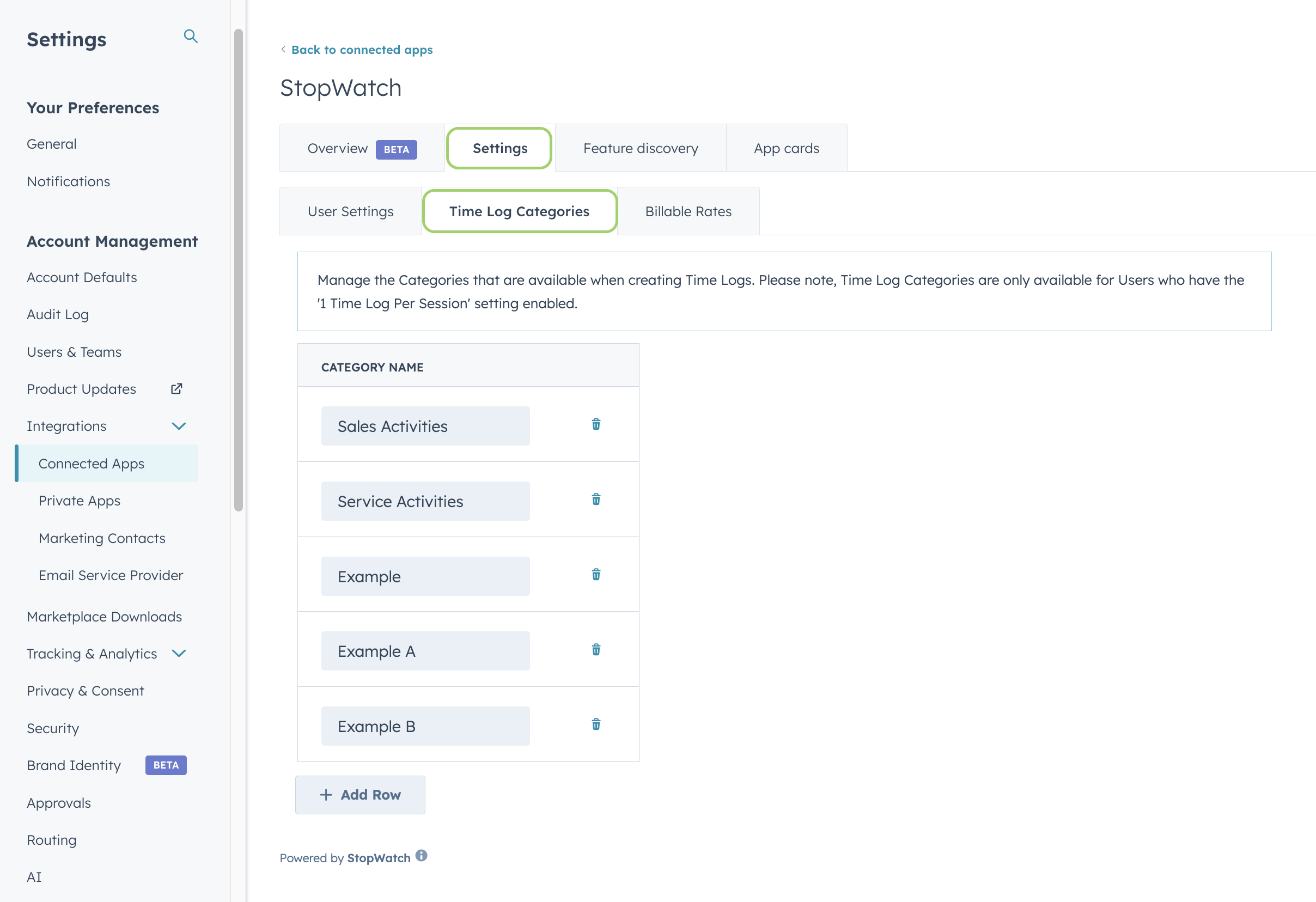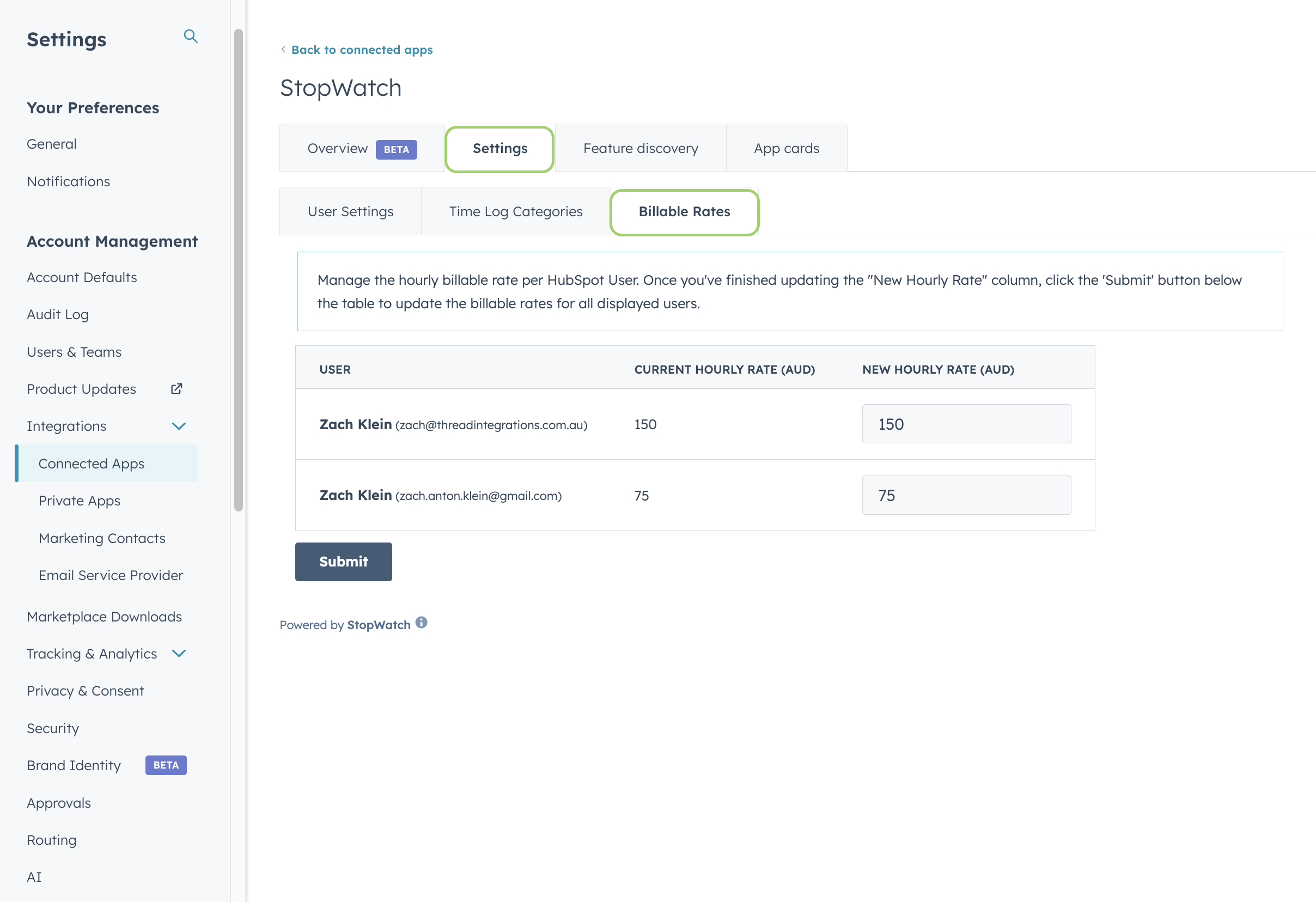 StopWatch for HubSpot comes with a number of user and account-specific settings. These settings can be configured within HubSpot by any user with App Marketplace Access permissions. To access StopWatch for HubSpot settings: